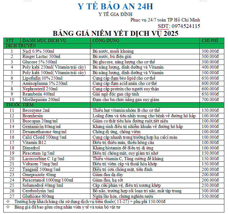 BẢNG GIÁ TẠI Y TẾ BẢO AN 24h